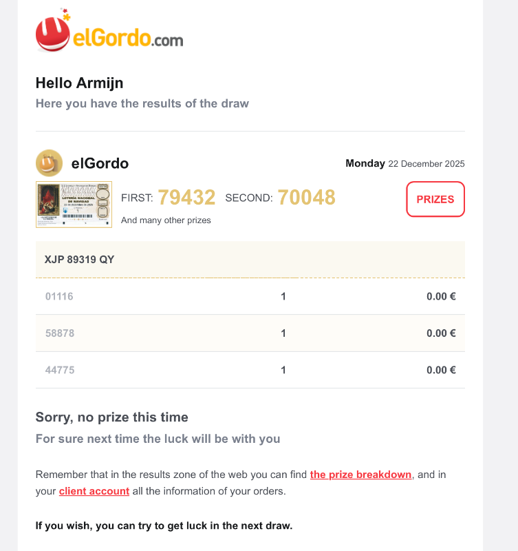 Gave foto. Spanje is altijd zo in de ban (traditie) over de El Gordo loterij. ik ga zo de loten kopen en iedereen die meedoet een PM sturen voor het tientje en de lot nummers zet ik hierin voor de FOMO voor de andere Onetimers 🙂