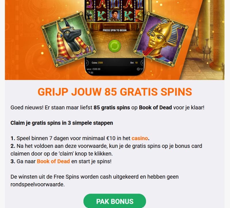 Pak tot 1020 gratis spins op het populairste slot is het feest bij de King of Casino. Meld je aan en ontvang een jaar lang elke maand 85 Gratis Spins Spins op Book of Dead