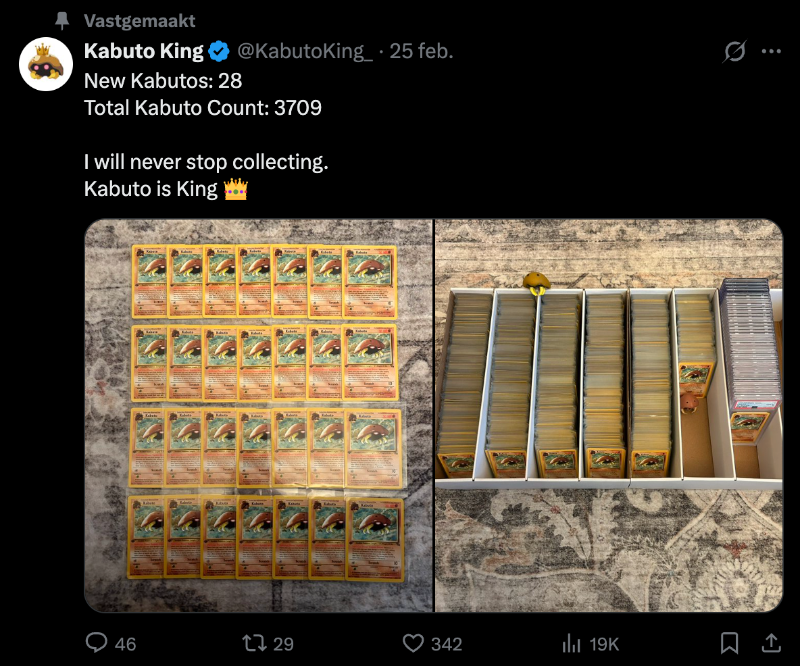 Op socials en Pokémon-fora duikt steeds vaker de nickname “Kabuto King” op: een verzamelaar die naar verluidt duizenden Kabuto’s opkoopt en spaart (er gaan verhalen rond van richting de 2000 stuks). En zoals dat gaat met internet: als één iemand ergens een missie van maakt, gaat de rest kijken, praten, meedoen… en dan verandert een “gewone” kaart ineens in een hype-object.