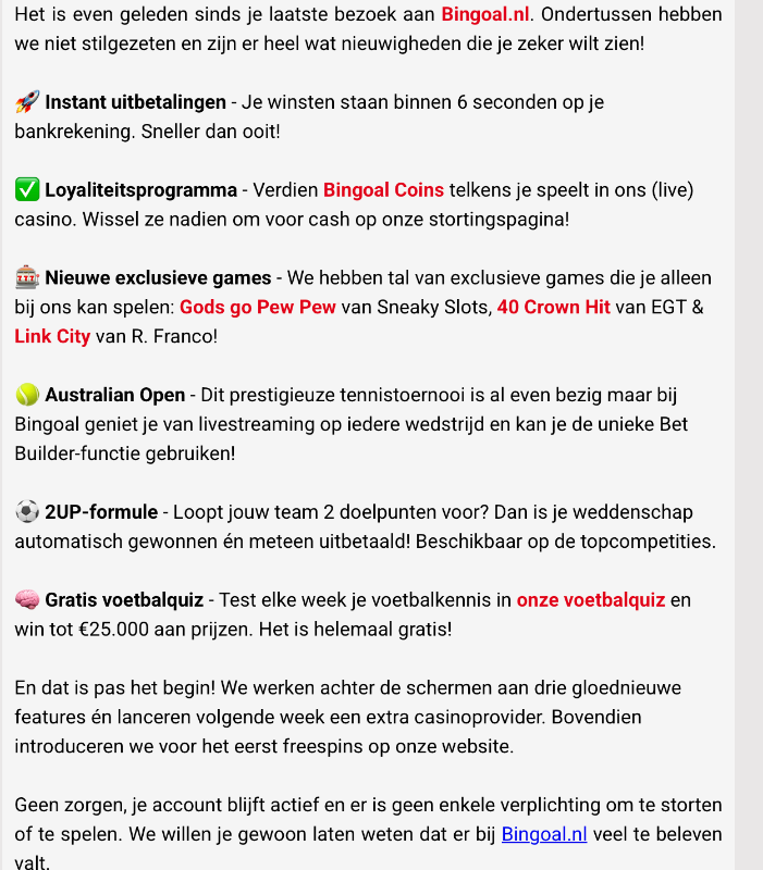 Ik kreeg inderdaad laatst ook een mailtje met 'we missen je' en de mededeling dat ze een adventskalender hebben. Nou speel ik er elke week wel even en mag ik niet mee doen met de adventskalender, dus eigenlijk een volledig misplaatst mailtje. Heb ik ze laten weten, maar daar geen reactie meer op gehad.