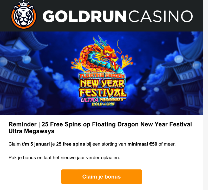 Ik zou zeggen GoldRun, bij de TOTO of kansino doen ze dat regelmatig anders, groot in de email zetten dat je gratis spins krijgt moet je ze ook even ophalen zonder te storten of bepaalde rondspeelvoorwaarden te voldoen. Het mag wel maar adverteer er dan niet groots mee.