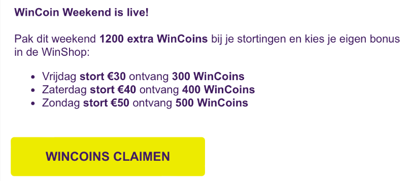 Voor wat betreft deze bonus aanbieding: ik zie €30 + €40 + €50 storten voor resp. €3 +€4 +€5 in waarde aan coins.