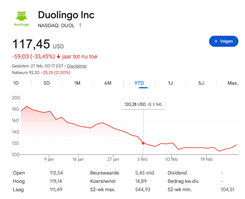 De koers is hard gecrasht; o.a. door een strategiewissel (meer focus op user growth i.p.v. monetization) en een zwakkere bookings-outlook, wat het sentiment raakte.