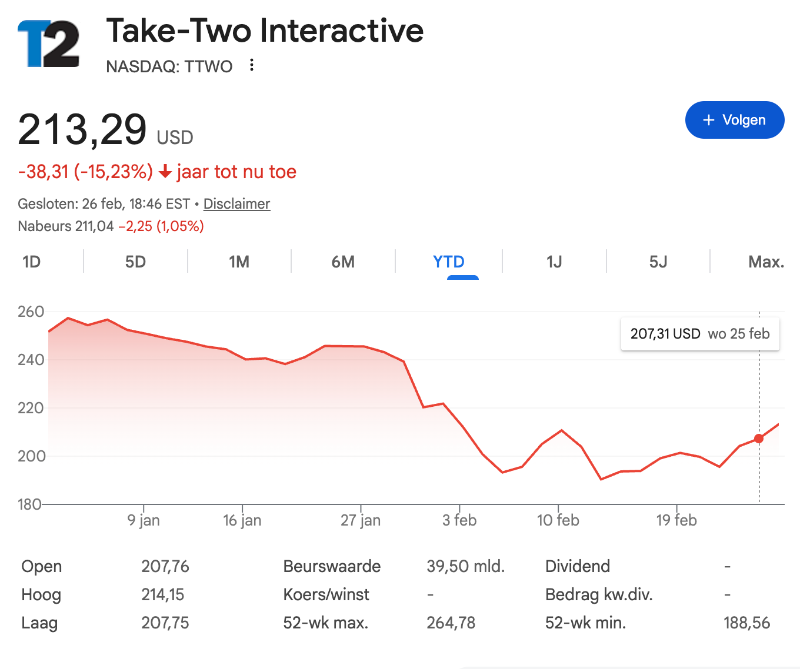 TTWO is het moederbedrijf achter Rockstar / GTA. De gamewereld kijkt massaal uit naar GTA VI en ik denk (gokje) dat richting release de aandacht en hype de koers best kan helpen.